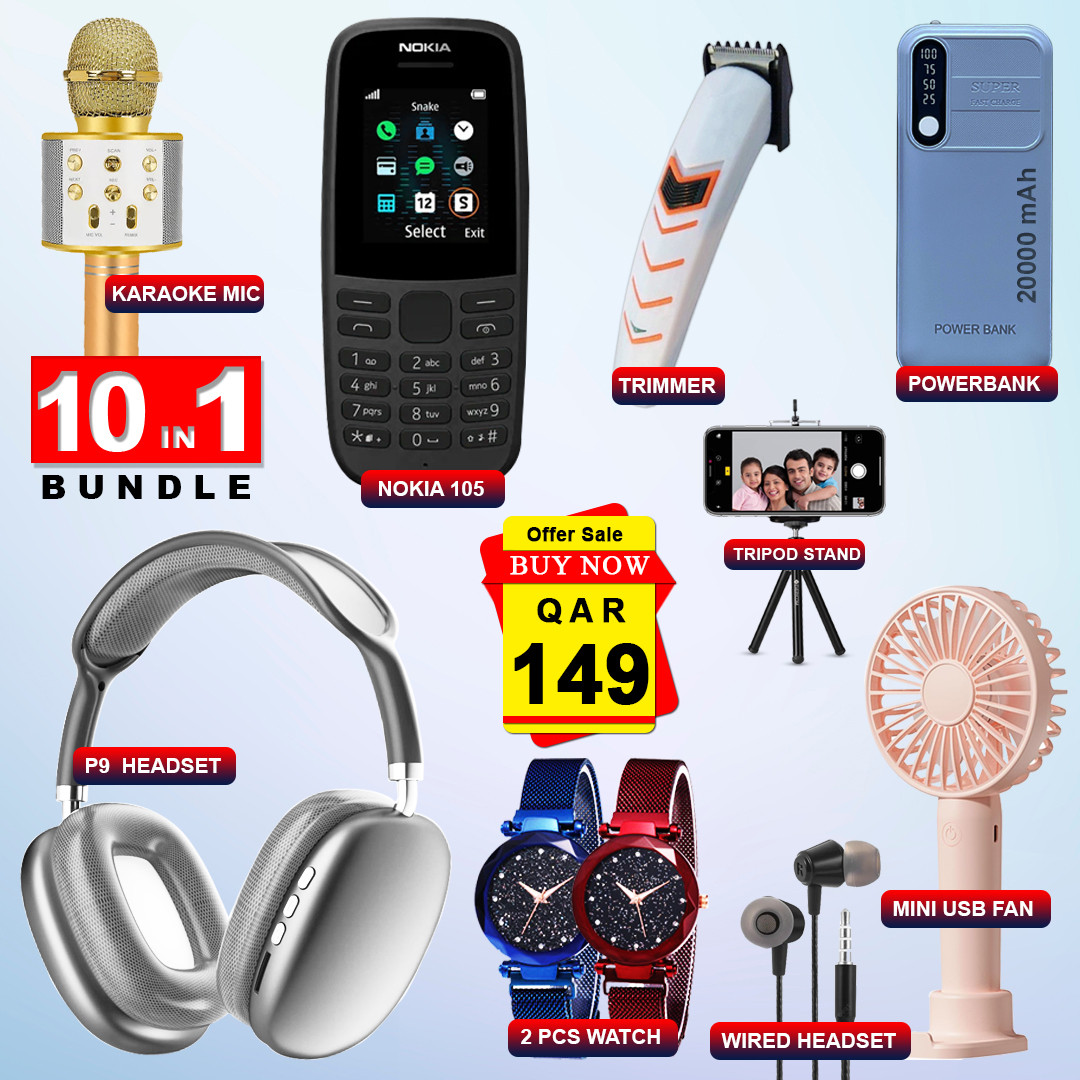 10 in 1 Bundle Offer - Nokia 105 Mobile, P9 BT Headphone, Hair Trimmer, Mini USB Fan, Power Bank 20000mAh, Wired Headset, 2 pcs Women Magnet Watch, Tripod Stand & Karaoke Mic