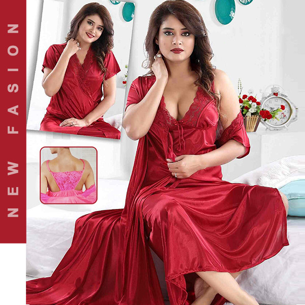 3 Pieces Solid Shades Satin Nightwear Set. SILKY