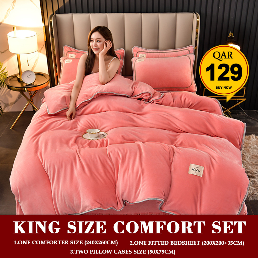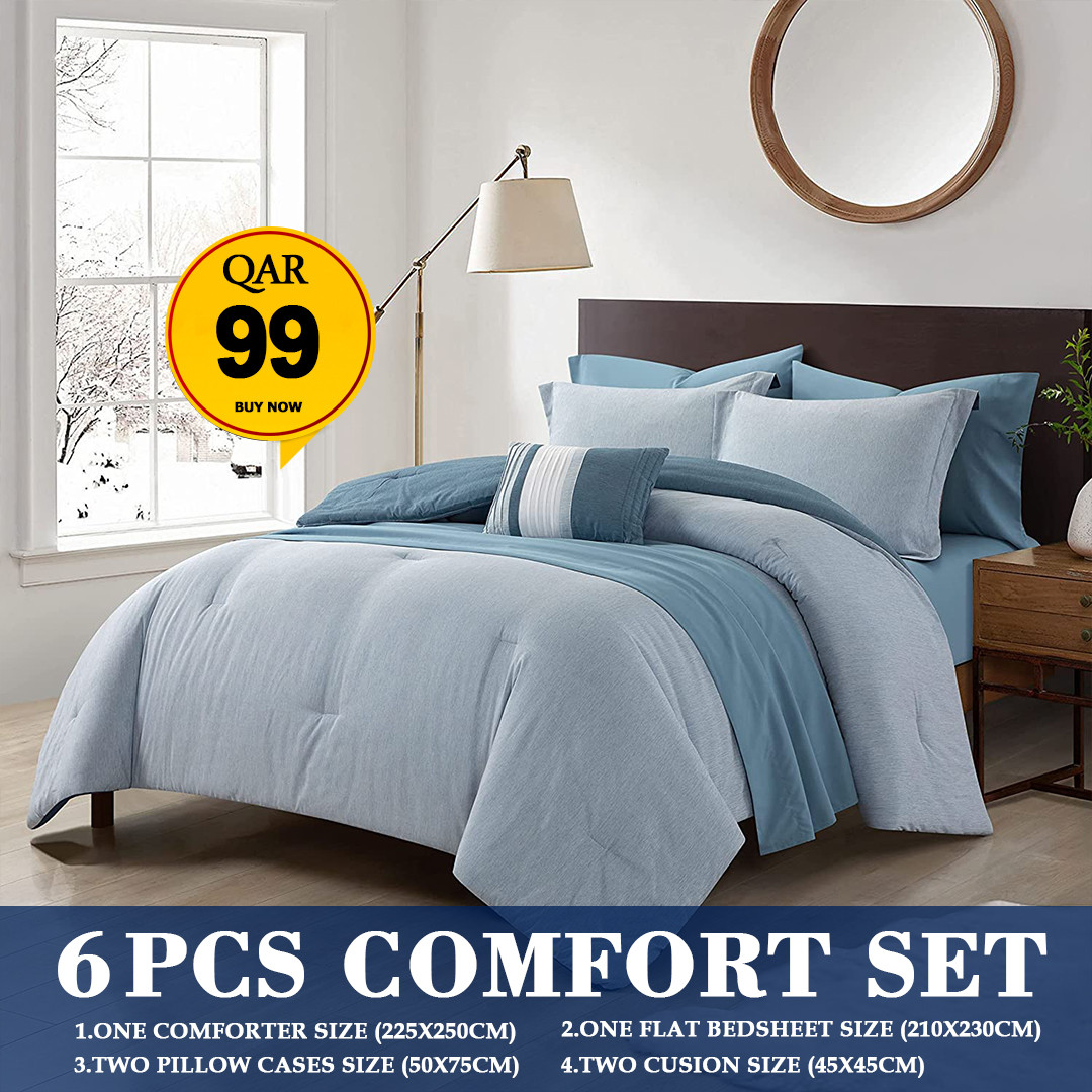 6 PCS COMFORT SET 1.ONE COMFORTER SIZE (225X250CM) 2.ONE FLAT BEDSHEET SIZE (210X230CM) 3.TWO PILLOW CASES SIZE (50X75CM) 4.TWO CUSION SIZE (45X45CM)